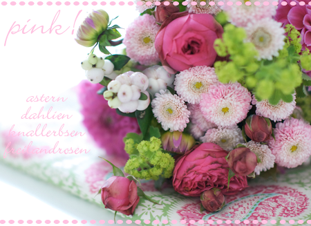 inspiriert durch so viele wunderschöne blogs möchte ich hier meine lieblinge für`s schöne leben zeigen. als willkommensgruß habe ich bei der floristin meines vertrauens einen herbststrauß zusammengestellt….herbststrauß? irgendwie sind mir wieder nur rosa und pinke blumen ins sträussle gewandert……ich kann mich einfach noch nicht vom sommer trennen….ich liebe diese farben! geniesst jeden sonnenstrahl, der sich zeigt.