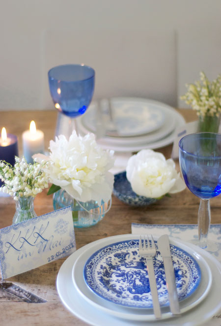 hier ja schon mal berichtet. das letzte zusammentreffen dieser art fand nach langer zeit bei mir zu hause im taunuswald statt. somit war von mir eine tischdeko-, aperitiv und amusegeule-zusammenstellung gefragt. der mai machte es mir blumen- technisch ziemlich leicht: pfingstrosen und maiglöckchen wollte ich diesmal mit blautönen kombinieren. inspiriert von der greengate-serie „fay-blue“ habe ich blauweisse akzente und den postkartentrend aufgenommen.