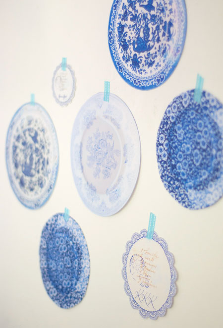 Und blau-weiß sind besonders schön aus – werde ich demnächst auch mal versuchen habe nämlich einen tollen läufer von green gate in blau weiß bekommen…Aber sag mal hast du die Teller nur mit Masking Tape an die Wand befestigt?!