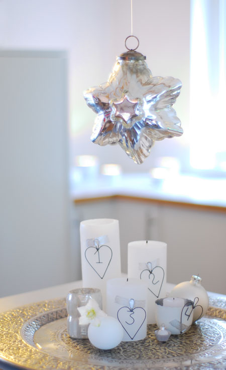 ach wie schön… die selben sterne hängen bei mir auch herum, bzw. es ist nur ein stern ;-)… ich liebe die draht-zahlen an den kerzen! was für eine simple, stilvolle und schöne idee!!!! nun frag ich mich ob du die selber gebogen hast oder es diese zu kaufen gibt? ganz herzliche grüße und eine wunderschöne adventszeit,