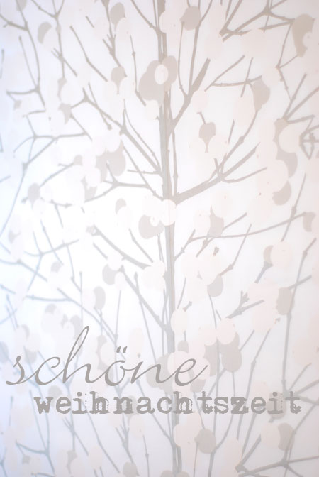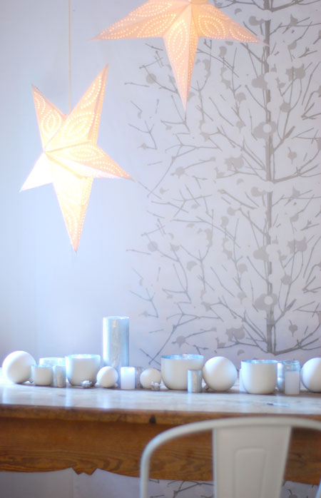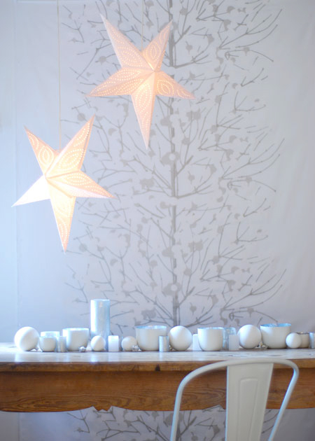 für meine diesjährige adventsdeko habe ich mich an meine prophezeihung von hier gehalten: alles in weiß mit silbergrauen akzenten. manch einer schafft`s selbst mit diesen 2 dezenten farbtönen zu übertreiben……. 😉 zumindestens waren die besorgungen für die deko ebenso einfach wie das farbkonzept: bei „butlers“ gab`s die lichter, bei „das depot“ die kerzen und meine neue entdeckung „marimekko“ hat den wunderschönen winterbaum-stoff „lumimarja“ geliefert. der wurde einfach an die wand genagelt.