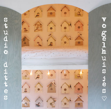 wie meistens bei gemeinsamen projekten ist der mann für die hardware und ich für das feintuning zuständig. mit freuden habe ich mich an die innenaustattung gemacht 🙂 für die wand habe ich die „vogelhuisje-tapete“ von studio ditte aus holland verwendet.