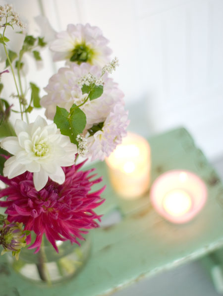 und weiter gings innen-herinnen mit eingedecktem tisch in den leichten sommerfarben, mit lichtern und einem wunderschönen selbstgebundenen blumenstrauss
