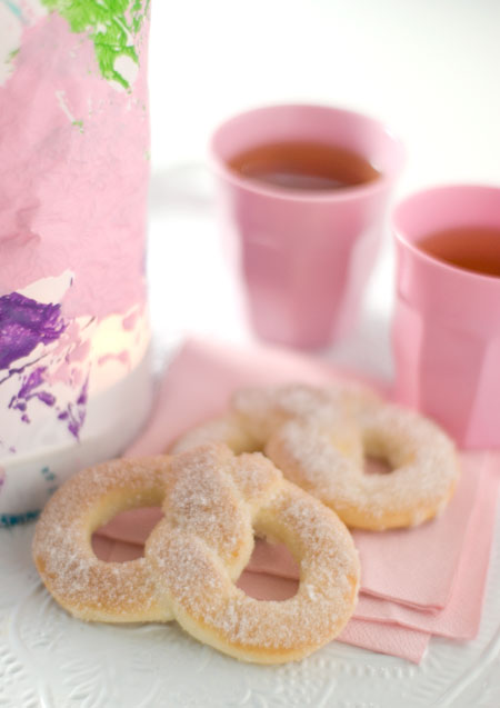 zur stärkung habe ich für die basteltruppe martinsbrezeln gebacken. die inspiration habe ich von nadine und ich wollte solche brezeln unbedingt mal machen. weil es allerdings schnell gehen musste, habe ich die einfache variante gewählt: den schon ausgerollten fertighefeteig aus dem supermarkt in lange schmale streifen schneiden, zu kleinen brezeln formen und backen, etwas abkühlen lassen und dann mit geschmolzener butter bepinseln und in zucker wälzen. die waren so lecker!