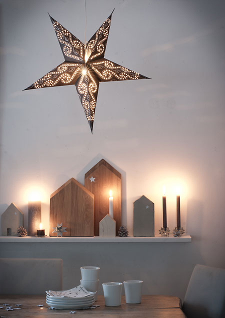 häuser sind schon lange meine leidenschaft, so sehr, daß ich das hausbauen sogar studiert habe….bei sinnenrausch habe ich rebeccas tolle betonhäuschen bewundert und wollte die irgendwann unbedingt mal nachmachen. letztendlich ist das hausthema gepaart mit sternen meine diesjährige weihnachtsdeko geworden. das mit den betonhäusern hat allerdings bei mir gar nicht funktioniert; vielleicht ist es doch gut, daß ich nicht architektin geworden bin 😉 da zurzeit das häuslebauen im dekobereich sehr beliebt ist, war es aber auch nicht schwer, hier und da attraktive „fertig“häuser zu bekommen. ich habe sie über unserem tisch auf einem langen holzbrett als stadt aufgebaut. damit es schön weihnachtlich wird mit sternenhimmel.
