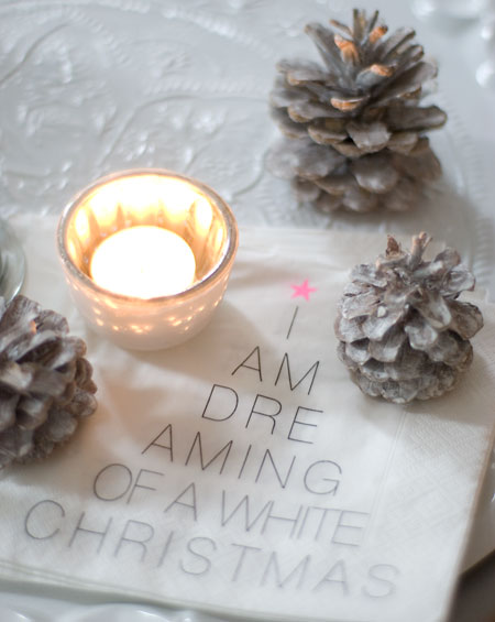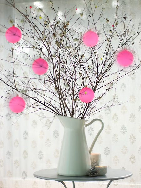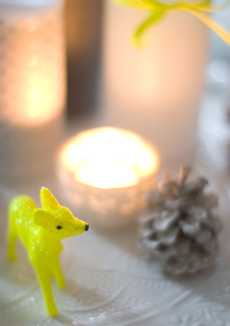 als blickfang dient ein krug mit schneebeerenästen. in die zweige habe ich neonkugeln und kleine pinke und gelbe perlen reingearbeitet. und überall finden sich die lasierten zapfen von hier wieder.