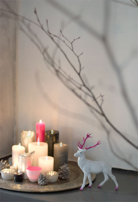 Ich würde mich nie trauen, mein Heim so zu dekorieren. Aber du schaffst es, diese Farben toll aussehen zu lassen. Ich bin sprachlos und wirklich beeindruckt. Meine Lieblinge: die Buche mit der Lichterkette, der Krug mit den Schneebeerenästen, das Geschenkpapier und der Kartenhalter. Verrätst du mir, wo du den tollen Teelichthalter in rosa/pink her hast?