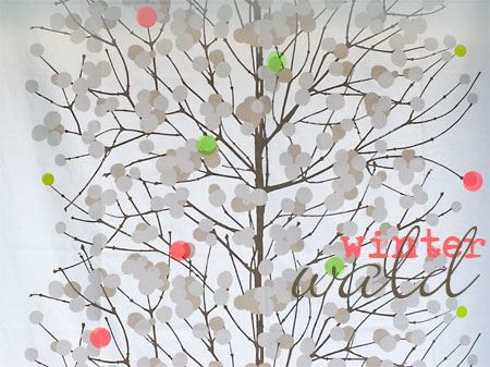 für die weihnachtsdekoration im wohn- und schlafzimmer (bei uns ein raum) zum thema „winterwald“ habe ich einiges vom letzten jahr wiederverwendet und mit neonakzenten gepaart. angefangen im schlafzimmer, wo ich den baum-stoff von marimekko als vorhang aufgehängt habe. die neonpunkte sind einfach mit pinken und grünen kreisen von maskingtape aufgeklebt.