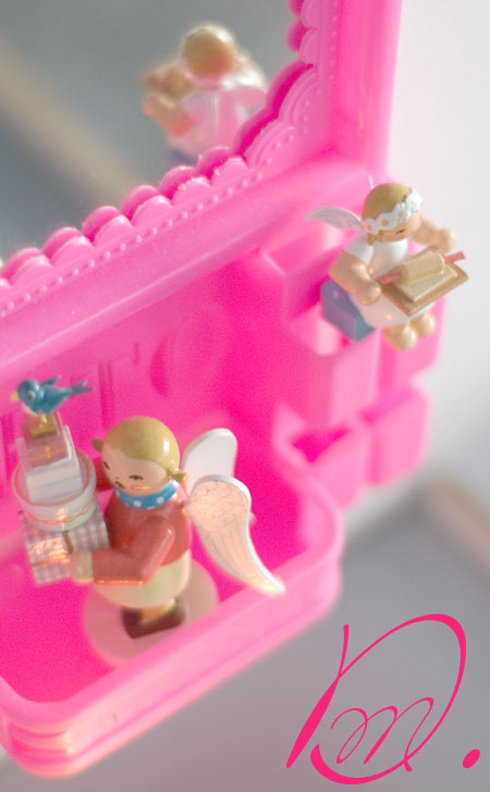 sehr zum leidwesen des männlichen mitbewohners, habe ich über meinen nachttisch diesen kitschigen spiegel aufgehängt. originalzitat: „das hässlichste möbelstück in unserem haus, ever!“ aber irgendwo mussten doch meine neuen wendt und kühn weihnachtsengel colourcode-kompatibel ihren platz finden……