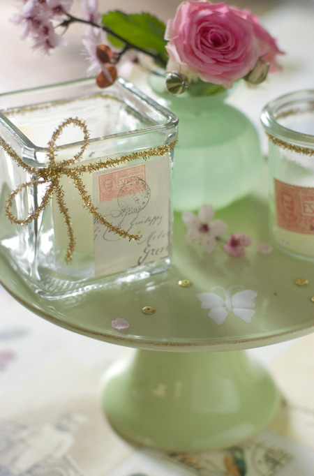 zu den goldenen lichtern von butlers, gab es noch selbstgemachte glaslichter: dafür habe ich „carte-postale“-sticker auf weck- und eckige gläser geklebt und mit goldener schleife verziert. einfacher geht`s nicht 🙂