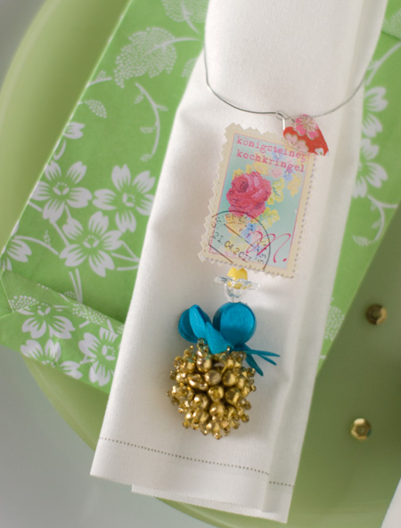 und als serviettenringe, bzw. namenskärtchen auf dem tisch verteilt. jeder gast hat eine eigene, personalisierte briefmarke erhalten, die ich im photoshop mit initial, datums-poststempel und titel gestaltet habe, hübsch im colourcode 😉 diese fake-briefmarke habe ich dann mit leicht ablösbarem, beidseitigen klebepunkt über die originalbriefmarke geklebt und die serviette durch die drahtschlaufe gezogen. das tütchen dazu wurde zum mitnehmen gleich mit auf den teller gelegt, weils farblich auch so schön gepasst hat 🙂