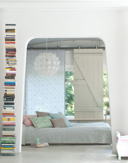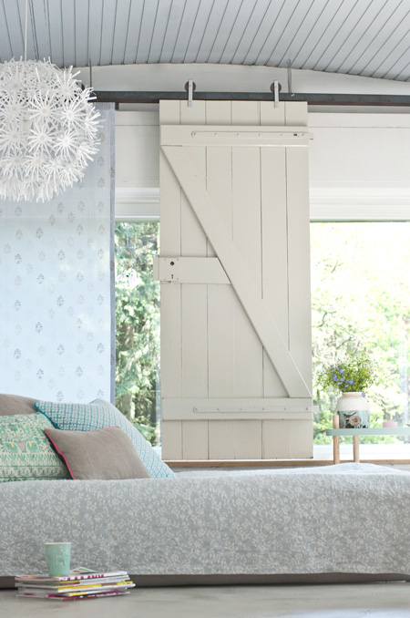 das lieblingszimmer in unserem waldhaus ist eindeutig von allen beteiligten: das schlafzimmer. wir lieben es, da man durch die grossen fenster das gefühl hat, direkt in der natur zu sein und wir fantastische ausblicke auf den schönen wald haben. am wochenende verbringen wir gemütliche stunden in dem grossen bett, frühstücken dort und jeder beschäftigt sich mit seinen multimedia-geräten, liest, döst oder geniesst den waldausblick. bis vor unserer umstrittenen sichtbeton-fussbodenrenovierung, hatten wir als sichtschutz sandgestrahlte glasschiebeelemente, die haben wir nun mit schlichten vorhängen und einer „scheunentür“ ausgetauscht. eigentlich wollte ich den mann nötigen ein scheunentor, wie beim schneesternchen zu bauen. aber wie es der zufall so will, habe ich doch tatsächlich im keller diese „scheunenartige tür“ im abstellräumchen entdeckt, sogar in gewünschter farbe lackiert! und der mann musste nur noch die rollen dranschrauben 🙂 wenns doch immer so einfach wär….