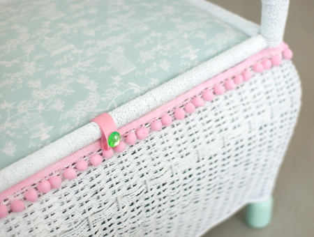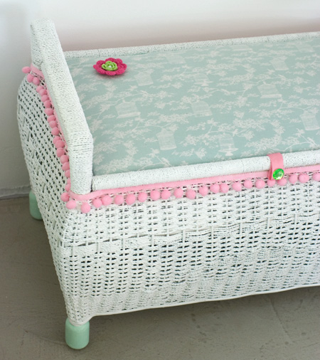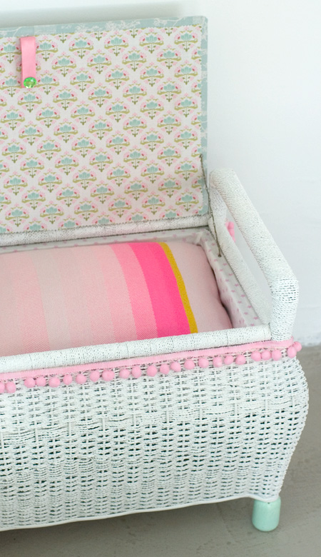 und noch etwas wunderschön-gemachtes ist neu in unserem lieblingszimmer: diese korbtruhe, in handarbeit von meiner freundin aufbereitet, mit liebevollen details, wie bommelborte, häkelblumen, mintfarbenen füssen. und auch das innenleben ist ein traum!