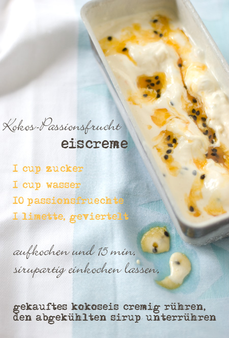 also konnte es mit der eisproduktion losgehen: inspiriert von donna hay, habe ich ein kokoseis mit passionsfrucht gemacht. ein huschi-fuschi rezept, wie ich es mag: einfach, easy-peasy in der mache und saulecker! kokos in kombi mit maracuja ist für mich ein absoluter favorit!