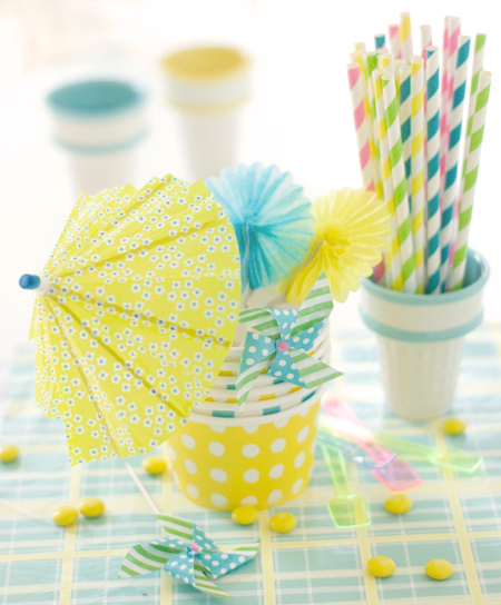 *papp-eisbecher, eislöffel, schirmchen, alle topper, strohhalme, kleine windräder, blümchenservietten, papiere: hema