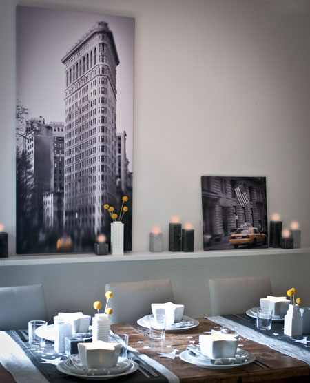 ein highlight des sich allmählich zum ende neigenden jahres, ist für mich auf jeden fall meine new york reise im frühling! ich war ziemlich geflasht von den eindrücken und habe schon dort gedanklich ein new york dinner geplant und gestaltet. umgesetzt habe ich es erst jetzt…. eingeladen war meine pekip-mütter-clique, die sich seit jetzt gut 6 jahren in regelmässigen abständen trifft, wohlgemerkt mittlerweile ohne nackte babies, vorzugsweise zu irgendwelchen abendveranstaltungen 😉 als deko und farben habe ich das auf den tisch gebracht, was für mich das stadtbild new yorks ausmacht: graues, schwarze töne (die wolkenkratzer) mit gelben akzenten (die vielen yellow cabs) und jede menge weisse sterne (von den usa-flaggen, die man überall sieht). für den anlass, habe ich einen lang gehegten plan umgesetzt: nämlich mein lieblings new-york-gebäude, das flatiron building in ganz gross auf leinwand abziehen zu lassen ( übrigens hier und supergut!).