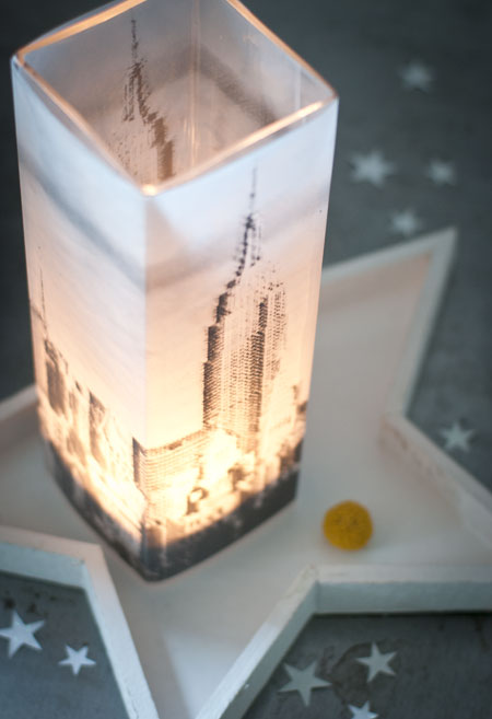 als weitere hochhäuser habe ich lichter angefertigt, in dem ich auf transparentpapier gebäude, wie das empire state building gedruckt habe und damit hohe, eckige vasen umklebt habe. teelicht rein, fertisch!