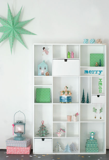 als blickfang im zimmer, habe ich das allroundtalent, das weisse holzregal (und nein: ich verkaufe es nicht mehr in meinem shop….) weihnachtlich bestückt.