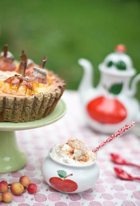 am liebsten mag ich äpfel (wie eigentlich auch alle anderen obstsorten) in form von kuchen. als ich den bratapfelkuchen bei „living at home“ entdeckt habe, musste ich ihn einfach nachbacken, in der hoffnung, daß die unglücksserie meiner kuchenbackversuche ein ende hat 😉 es ist aber auch alles im rezept enthalten, was mein süßherz anspricht: im mürbeteig mohn, in den kleinen bratäpfelchen und im schmandguss jede menge marzipan und zimt: fantastisch!  und diesmal gab es auch kein back-malheur 🙂 das kind und ich haben uns bei dem traumwetter eine schöne sause im garten geleistet. mit retro-apfel-geschirr und zieräpfelchen als herbstliche deko.