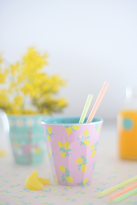 *papier, melaminschalen, becher, papierservietten, briefumschlag mit zitronenaufdruck von rice hier gekauft.