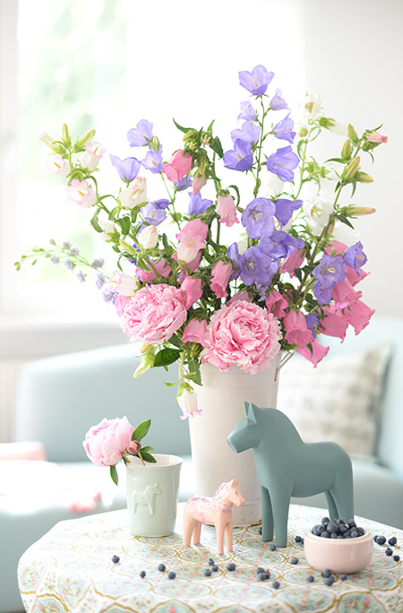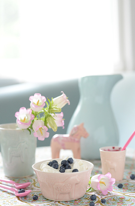 … jetzt hat es auch uns erwischt: unsere tochter ist total in pferde-love! wir waren tatsächlich zum dritten mal in „ostwind“ – und das bei schönstem sommerwetter und 30°! wenn es nach dem süssen kind geht, gerne möglichst bald auch ein viertes mal 😉 wobei ich diesen pferdefilm durchaus muddifreundlich finde. ich hatte wirklich schlimmeres befürchtet. netterweise spielen tolle schauspieler, wie jürgen vogel und corinna harfouch mit, und das ganze ist sehr unterhaltsam… das soll hier aber nicht in kinowerbung ausarten, also komme ich mal zu meiner pferdeliebe: die bezieht sich nämlich auf die aus schweden kommenden dekopferde, sprich dalapferde. um dem kind und mir eine freude zu bereiten, habe ich die dalapferdebackförmchen rausgekramt und scones darin gebacken. dazu gab es reichlich blaubeeren, marmelade und sahnequark. hübsch serviert in keramik (wie soll es anders sein) mit dalapferdchendekor, von der schwedischen keramikkünsterin mia blanche. juniblumen, wie blaue marienglockenblumen und rosa pfingstrosen, sorgen fürs sommergefühl: