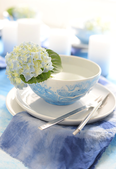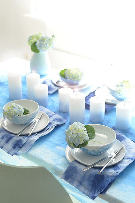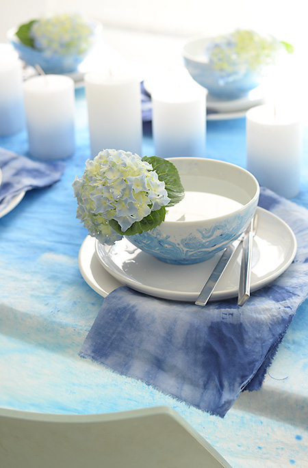 zusammen mit den batikservietten, der mit textilfarbe selbstbesprühten tischdecke und den dip-dye-kerzen ein schönes team.