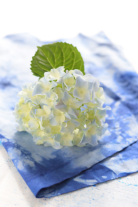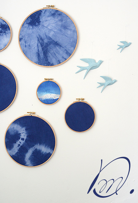 durch diverse magazinbeiträge inspiriert, habe ich mich mit meiner tochter einen ferientag lang dem batiken gewidmet. besonders die japanische technik „shibori“ hat es mir angetan. eigentlich wird hierfür mit echter indigofarbe gefärbt und es entstehen die typischen knallblauen muster. so schön! leider habe ich aber keine indigofarbe gefunden und musste auf herkömmliche blaue textilfarbe zurückgreifen, was aber auch wunderbar klappt. das kind und ich haben ganz schön rumgewutzt – gut dass die färberei bei schönstem sommerwetter draussen stattfinden konnte! die ergebnisse haben wir zu kleinen kissen vernäht, die ganz wundervoll das grosse marimekko-kissen ergänzen. weitere batikwerke präsentieren sich in den stickrahmen und schmücken die wand hinterm sofa.
