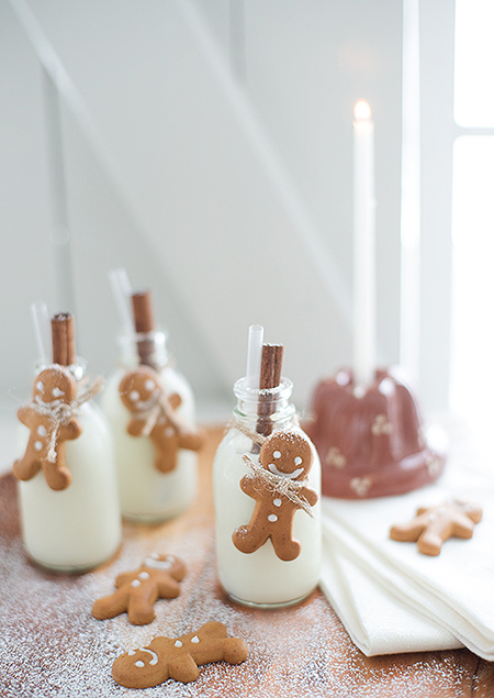 diese lustigen kameraden gab es in unserer dorfbäckerei. für den brauch, dem weihnachtsmann milch und kekse zur stärkung hinzustellen, habe ich sie an kleine milchfläschen gebunden. die zimtstangen dienen als strohhalm (das funktioniert wirklich!) und geben beim trinken einen schönen, dezenten zimtgeschmack ab.