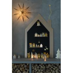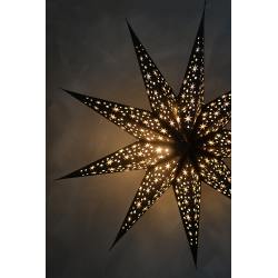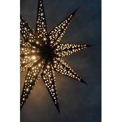 Himmlischer Papierstern "Cassiopeia Black" in Schwarz mit weißen Sternchen von Bungalow DK. Der Stern besticht durch seine vielen kleinen Punkt-Ausstanzungen, durch die das Licht wie Sternchen strahlt. Lässt jeden Raum erstrahlen!