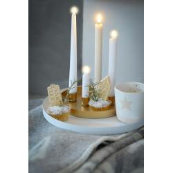 Stilvolles Metalltablett mit 4 magnetischen Kerzenhaltern, Gold lackiert von Rico Design. Das Tablett besticht durch seine Schlichtheit und ist sehr variabel. Durch die magnetischen Kerzenhalter, können diese verschieden platziert werden und weitere Dekoelemente auf dem Tablett präsentiert werden. Prädestiniert für die Gestaltung eines modernen Adventskranzes, eine elegante Dekoration, aber nicht nur in der Weihnachtszeit. Kerzenhalter passend für 2,1cm Kerzen.